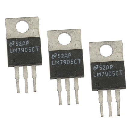 National LM7905CT (-5V) 1 Amp IC voltage regulator in a TO-220 package. These have had their leads trimmed slightly for PCB mounting. Original National Part - New! Sold in a package of 3.