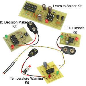 If you are introducing soldering kits to your students, you'll want this value packed 4 in 1 package. The student starts by following detailed instructions on "how to solder" and builds a non functional "learn to solder kit" which includes a PC board and all parts. After he or she has gained the skills necessary to solder properly, the student progresses on to each of the 3 exciting kits listed below. Each one operates on its own and can be mounted in an optional box if the student desires. At the conclusion, the student has built 1 non functional kit and 3 fully operating kits that he/she can enjoy. All kits are Skill Level 1 and come complete with all parts, PC board and instructions. Each kit (except the non functional Learn To Solder Kit) operates from a 9V battery (not included).
