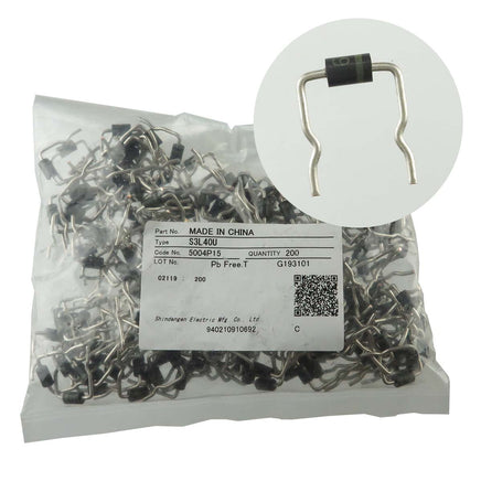 Heavy duty fast recovery rectifier Part# S3L4OU by Shindengen. Rated 400 VRM @ IO = 3Amp. Supplied in the AX14 case with leads cut and formed as shown. Sold in a factory package of 200. New - Retails for $190 for 200. The Electronic Goldmine Price $10.