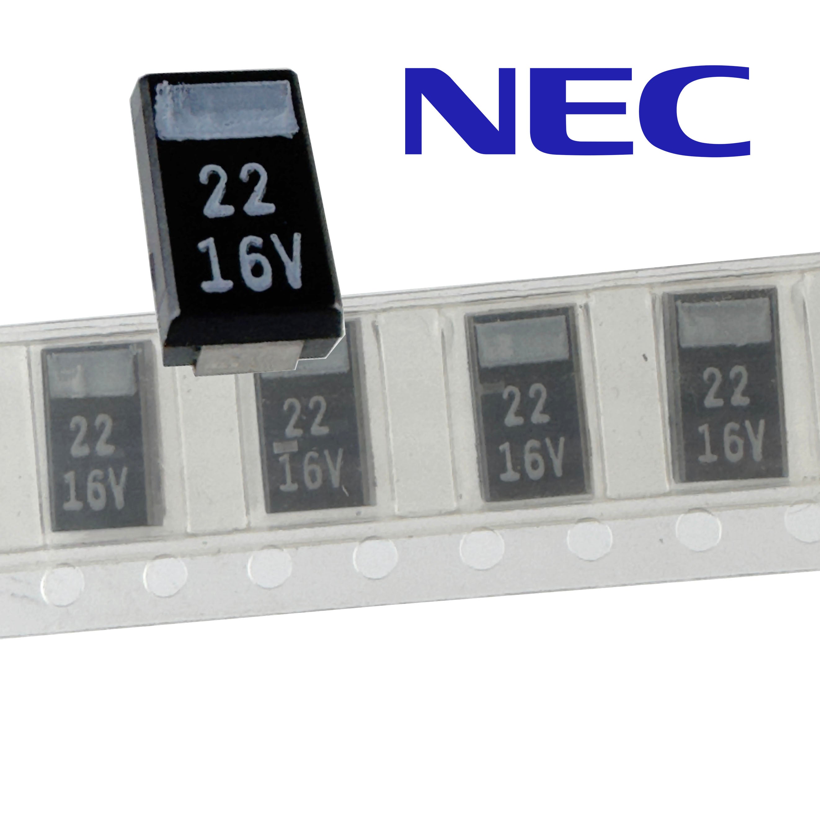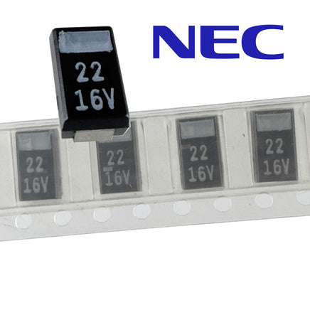 NEC solid tantalum capacitor is rated 22uF 16V and is 7.3mm x 4.3mm x 2.8mm thick. Brand new! Sold in a package of 20.