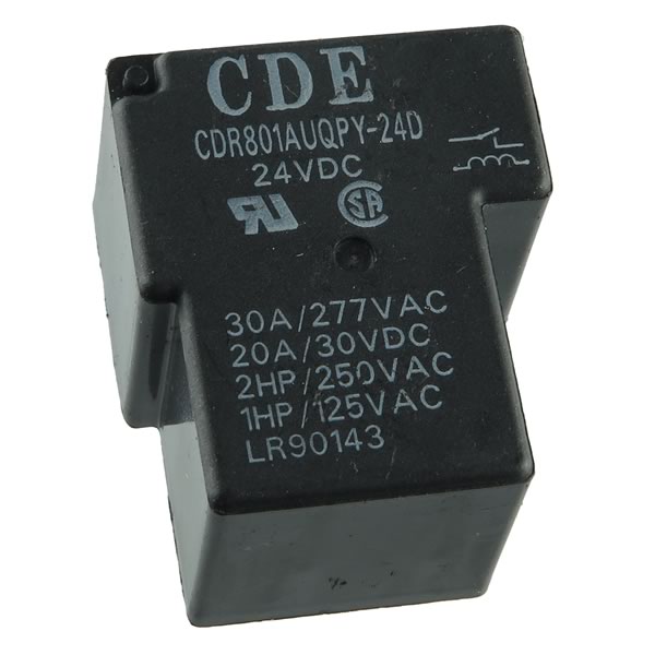 24VDC SPST (1 Form A) Relay with high switching capacity. Rated 30A/277VAC; 20A/30VDC; 2HP/250VAC; 1HP/125VAC. Coil resistance measures 640 Ohm. Size is approximately 1.256" long x 1.06" wide x 0.795" tall. Fully enclosed type. Has 4 PCB pin terminals. CDE Part# CDR801AUQPY-24D.