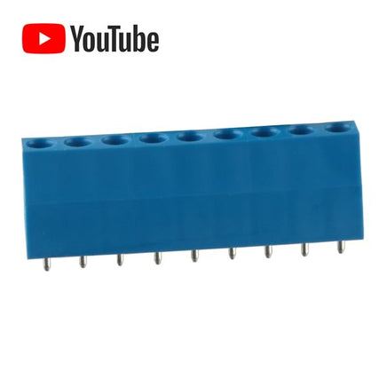 Terminal block for PC boards features 9 positions and is thru-hole type. Features 5mm pitch and screws on top to tighten wire in. Precision made. Overall size about 1.77" long x 0.37" thick x 0.58" tall (excluding pins). Made for 26 to 18 AWG wire size.