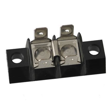 BEAU2400 2 position insulated barrier block features 4 common tie points for wires or female spade lugs. Size about 1.4" long x 0.56" x 0.43" tall (excluding male lugs). Sold in a package of 4.