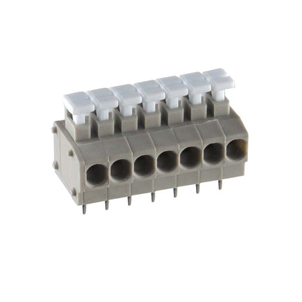 Beleks 675-107 Fanuc board connector connects up to (7) 20-26AWG wires to PC board with amazing ease. No screw down required-just push down the lever on top, insert wire, then release. An amazingly strong connection is made that won't release until you press the lever again. Spacing between pins is 3.8mm and 5mm front to back. Rated 300V 10Amp.