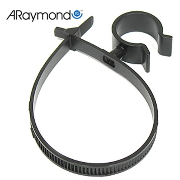 Super strong 8" long heavy duty cable tie has an attached clamp that can attach to 0.75" diameter pipe. Commonly used in automobile harness assembly to hold bundles of wire to pipes/tubes. Tie wrap width is 0.29". Clamp width is 0.5". Clamp swivels on tie. Made by ARAYMOND.