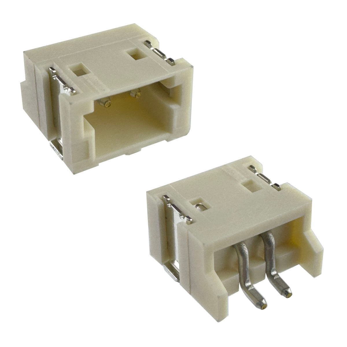 Miniature 2 position miniature SMD mount connector for female headers connector (on cable), made by JST Sales America. Type S2B-ZR-SM3A-TF. Sold on tape and reel package of 20.