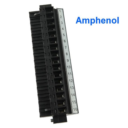 Amphenol PCD Series top entry 16 position plug with locking ears Part# ELFP16150E is 90mm wide. It mates with 5mm pitch ELFH series headers. Has 16 slotted positions to allow wires of 12-26AWG to be held firmly. Rated 15Amps.