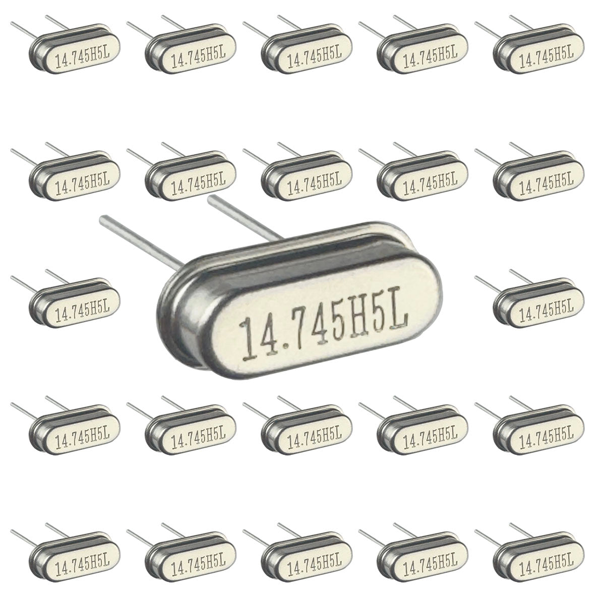 Tiny metal HC-49/S metal case 14.7456 MHz crystal. CL is 20pf. Brand new. Sold in a package of 25.