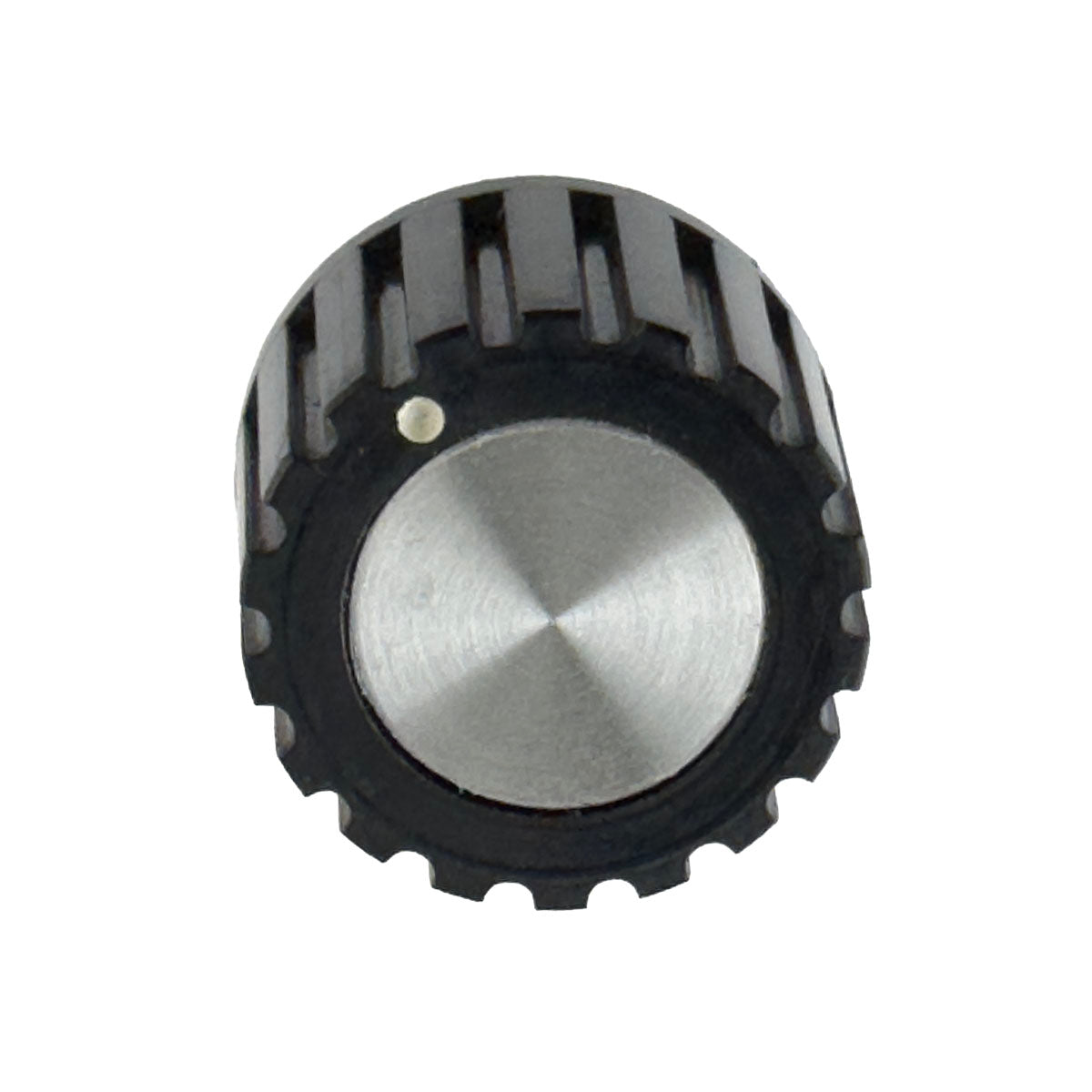 Alco Lexington Series set screw knob for 1/4" shaft is black in color with brushed aluminum insert and white indicator dot. Overall size is 0.7" dia. x 0.52" tall. Alco Part # PK1100/B. New!