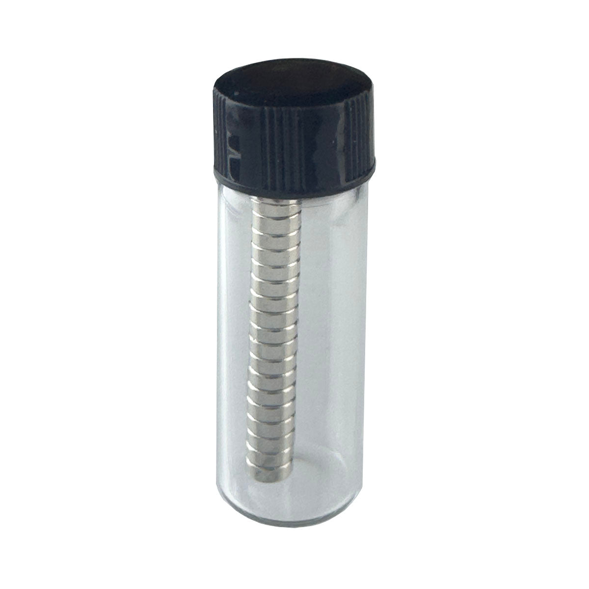 Glass vial containing 20 super strong 6MM x 2MM tiny Rare Earth nickel plated Neodymium Super Magnets. Hold papers, craft projects to metal refrigerator doors or activate reed switches, Hall effect sensors. Brand new!