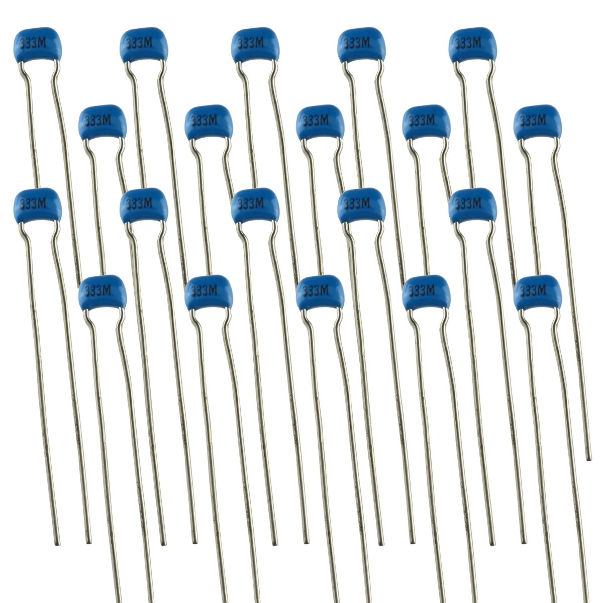 A miniature monolithic capacitor is rated 0.033uF @ 50V (333m). Size only 0.2" x 0.1" thick x 0.18" tall. Sold in a package of 25.