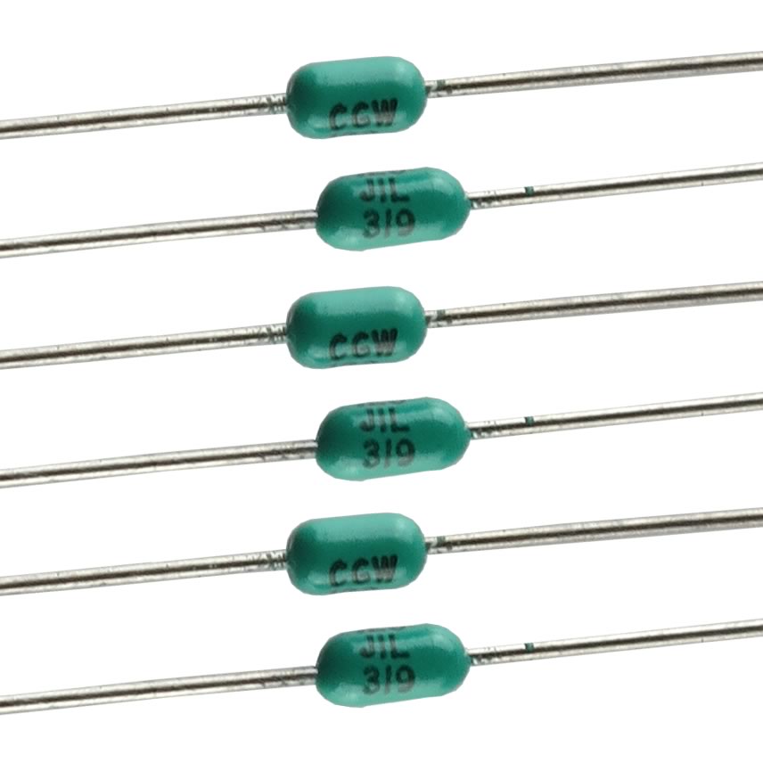 Corning Glass Works 12pf 50V tiny axial capacitor type CGW 120JIL is only 0.16" long x 0.064" diameter. Found in amplifier circuits and guitar effects. New! Sold in a package of 10.