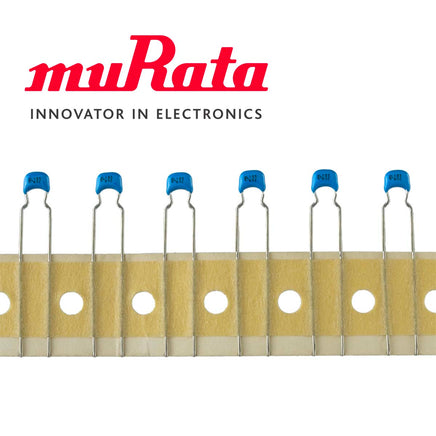 Murata blue epoxy mono capacitor is rated 0.01uF (103) 50V 10%. Size only 0.18" x 0.165" x 0.08" thick. Sold in a package of 25 on tape and reel.