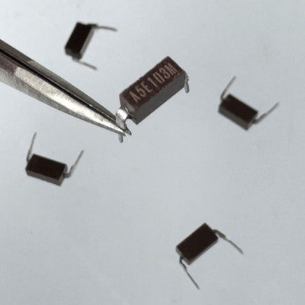 Dip case monolithic capacitor is rated 0.01uF (103) @ 50V. Size is 0.26" long x 0.128" tall x 0.092" wide. Designed to plug into a Dip socket. Retails for over $2 each. Sold in a package of 5.