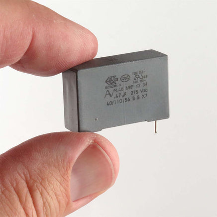 Kemet R46 metallized polypropylene film capacitor is rated 0.47uf 275VAC±20%. Has PC leads as shown. Size 1.03" x 0.326" x 0.67" H. Sold in a package of 4.