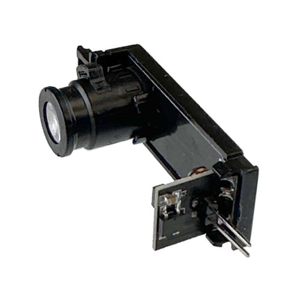 Small Type A projection assembly consists of a constant current Led Driver that operates on 9 to 36VDC, a 4 lens internal projection lens with fixed focus and a powerful Cree white projection Led mounted to an aluminum plate. The round lens has a slot that holds a slide out holder for a 0.40" dia. round piece of film (film not included). This powerful projector assembly was made to project various auto manufactures logos in full color onto the ground when you open the car door (logo size was about 1 foot to 18" diameter on pavement). The projection lens is about 0.58" dia. X 0.77" long mounted to a 2.32" long x 0.73" wide assembly with small 0.62" sq. Led current driver board attached. To use simply connect any source of 9V to 36VDC to the 2 pins. No polarity needed.