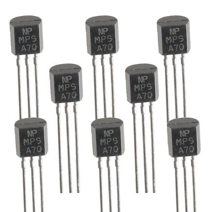 Plastic TO-92 case PNP transistor type MPSA70 is rated 40V 100mA 625mW. Sold in a package of 10.