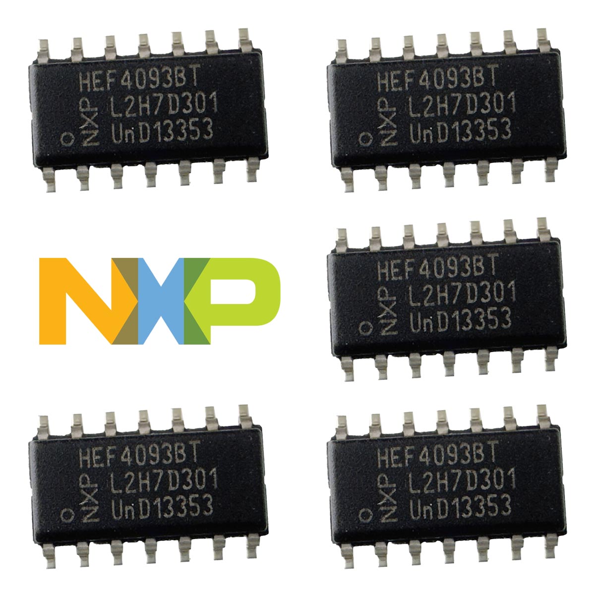 NXP HEF4093BT is a Quad 2 input (4 Channel) NAND Gate with Schmitt trigger input in a SOIC-14 SMD Package. Sold in a package of 5.