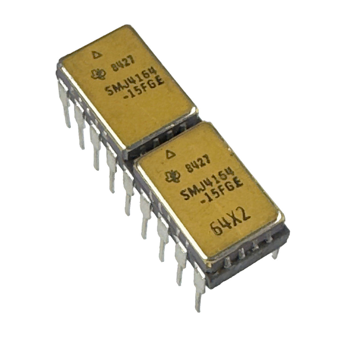 Texas Instruments ceramic 18 Pin Dip with two gold plated 4164 RAM IC's mounted on top and electrically connected together inside the ceramic package (They have printed on top 2 x 64). These were made for the military. New, very old stock - 184 date code.