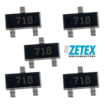 Zetex FMMT718TA SMD SOT-23-3 is a 20V @ 1.5Amp PNP transistor rated for 625mW, 180MHz and hFE = 300 @ 100mA, 2V. Sold in a package of 5.