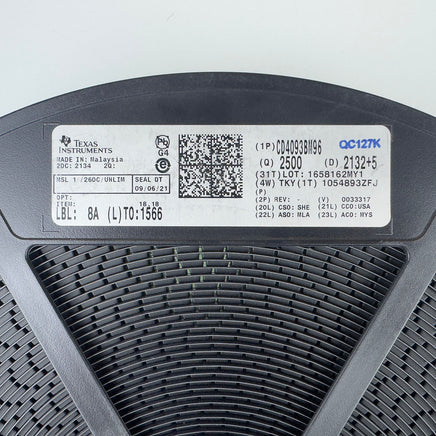 Texas Instruments CD4093BM is a quad 2-input NAND Gate with Schmitt triggers. Supplied in an SMD SOIC-14 case. Full brand new reel of 2,500. Retail value = $1,213.00 for a factory reel of 2,500.