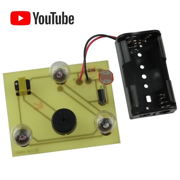 This very unusual kit emits random pops and random explosions of bright white light when it is in the dark (kit has a CDS cell to sense the absence of light). This kit produces one of the most unusual "out-of-this-world" effects! Features SCR and CDS cell circuitry with 3 bright lamps and a piezoelectric speaker. This easy to build kit creates a spectacular visual and sonic display. It may even cause speculation as to whether or not it was left here by aliens! We built 4 of these kits and put them is a darkened room and the resulting sound and light display was amazing. Size of PC board: 2.9" x 2.4". Operates on two "AA" batteries (not included). Complete with all parts, PC board and instructions. Sold in a bulk package of 25 kits. Skill Level 1