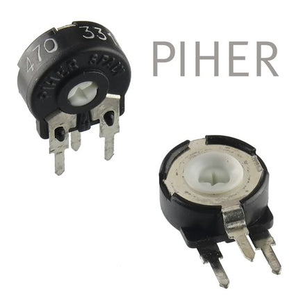 Prime Piher PT10 series 10mm linear taper 470 Ohm trimmer resistor. Has 20% tolerance and a nominal power rating of 0.15W. Vertical mount with horizontal adjustment slot on side. Size (excluding leads) is approximately 10.3mm (0.4") diameter x 4.5mm (0.18"). Has 3 leads for through hole mounting. Sold in a package of 10.
