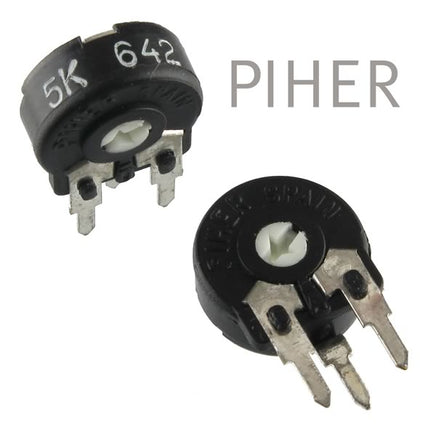 Prime Piher PT10 series 10mm linear taper 5K trimmer resistor. Has 20% tolerance and a nominal power rating of 0.15W. Vertical mount with horizontal adjustment slot on side. Size (excluding leads) is approximately 10.3mm (0.4") diameter x 4.5mm (0.18"). Has 3 leads for through hole mounting. Sold in a package of 10.