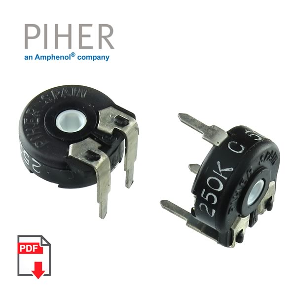 Prime Piher PT10 series 10mm linear taper 250K trimmer resistor. Has 20% tolerance and a nominal power rating of 0.15W. Carbon resistive element is housed in a dust proof enclosure. Horizontal mount with 2mm hex adjustment slot on top. Size (excluding leads) is approximately 10.3mm (0.4") diameter X 4.5mm (0.18"). Has 3 leads for through hole mounting. Sold in a package of 10.| Additional Resources |