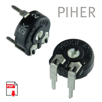 Prime Piher PT10 series 10mm linear taper 5K trimmer resistor. Has 20% tolerance and a nominal power rating of 0.15W. Carbon resistive element is housed in a dust proof enclosure. Horizontal mount with screwdriver adjustment slot on top. Size (excluding leads) is approximately 10.3mm (0.4") diameter x 4.5mm (0.18"). Has 3 leads for through hole mounting. Sold in a package of 10.| Additional Resources |