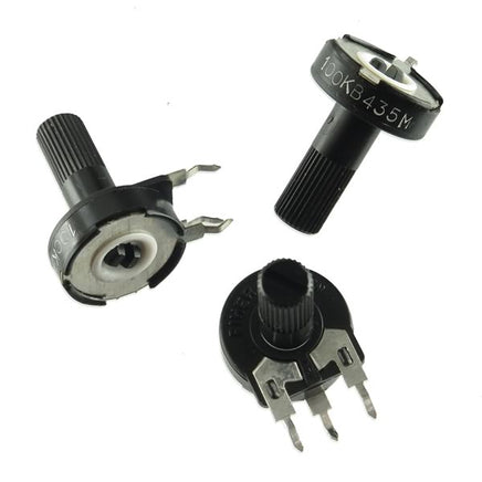 Vertical trimmer resistor is linear taper 100K. Size is about 15mm dia. Features knurled 1/4" dia. shaft which is 0.6" long for knob. Sold in a package of 10.