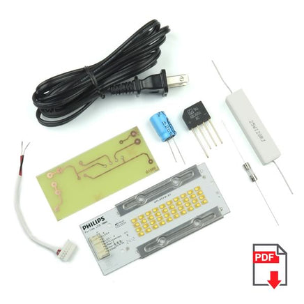 High lumen Fortimo warm white 54Watt light module is the most powerful one we have ever had. It operates from 118VDC and produces 6000 lumens light output. This module was to be installed in super high power portable outdoor construction lights. They are new - removed from heatsinks/fixtures when the company changed design.We have created a simple 118VDC power supply kit you can solder and build with an included PC board, however since it is connected directly to the AC line you must insulate it to not allow anyone to come in contact with it. Also note this supply allows you to test out the module and view its extreme brightness. It is not current regulated and is not suitable for any long term use. Also note that the module requires heat sinking and can be damaged by heat if it is operated more than a couple of minutes without a heat sink. Size about 4.25" x 1.80" x 0.15" thick. Consists of 40 ultra blinding SMD LEDs. Made by Philips, this sophisticated module even has a built in thermistor on board. Current required: about 500mA. You will be amazed at the blinding warm white light. You get one module and one 3.5" x 1.5" PC board with parts. Please download instruction sheet below. Note : You must solder these parts together. No case or heatsink is provided. Keep in mind you must use a current regulated driver for long term use. Power supply operates on 120VAC 60Hz. Module operates on 118VDC @ 0.500Amp. Module is removed from new equipment and may have a little white thermal grease on it, plus some of the LEDs may have a slight flat surface on lens ( does not affect operation) Retail for module alone is $65.