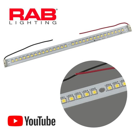 RAB® Lighting light bar is 9.75" long x 0.56" wide x 0.1" thick. Has 30 brilliant white powerful SMD LEDs on an aluminum plate and produces a blinding white light. Will operate on as low voltage as 9VDC @ 0.6Amps, however it is designed to operate at 12VDC @ 4Amps max. At 9VDC the bar can be operated without attaching to a metal surface, however at 12VDC it must be mounted to a metal heat dissipating surface; otherwise it will be damaged. Designed to be connected in series to other bars if desired. The light from this is amazing! New.| Additional Resources |