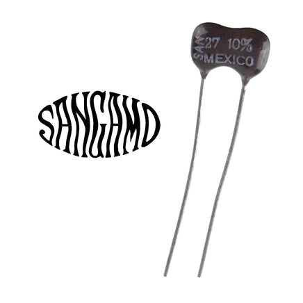 Sangamo 27pF 10% 300V dipped silver mica capacitor is 0.42" × 0.15" × 0.32" H. Brand new with full length leads.WARNING: This product can expose you to chemicals including lead, which is known to the State of California to cause cancer. For more information, go to www.P65Warnings.ca.gov - Why is this here?