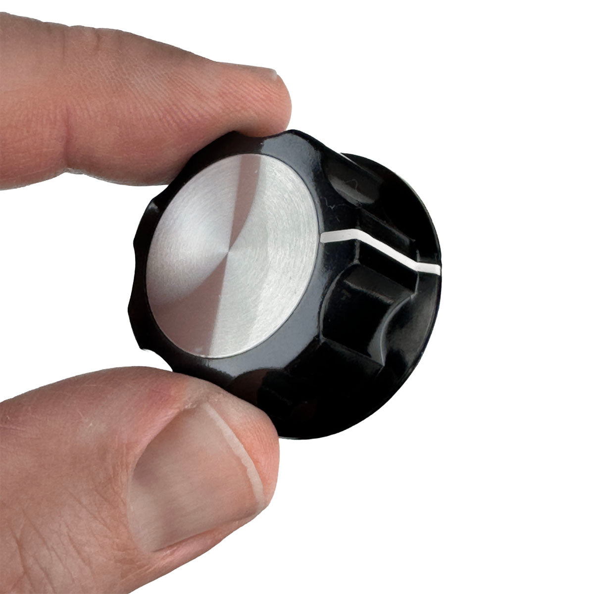 Large beautiful precision knob from Alco is Lexington Series, model PKES120B¼, made for 1/4" diameter shafts. Has attractive black fluted grip with white pointer, skirt, and brushed aluminum inset. Has a set screw for firm grip. Measures about 1.3" in diameter × 0.624" thick. Brand new - retails for $4.35.
