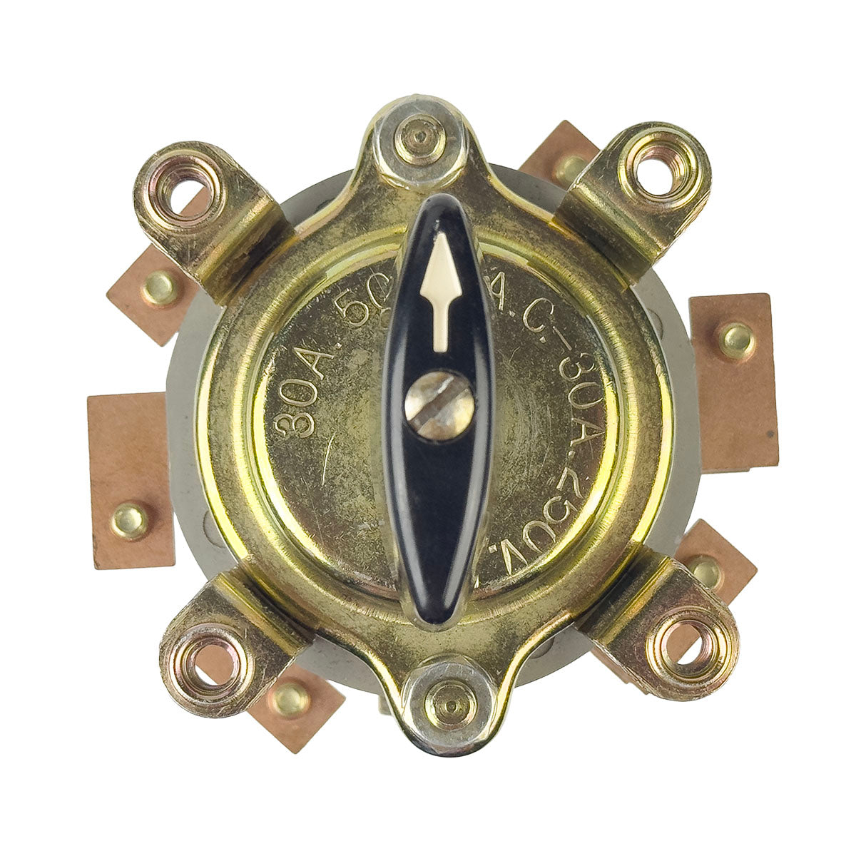 The gray stacked decks function as independent switching sections, allowing multiple circuits to be controlled simultaneously. Heavy brass and copper contacts provide excellent conductivity and reliability, while the zinc-plated steel housing offers outstanding durability. The black handle rotates smoothly, ideal for use as a selector or power switch.
