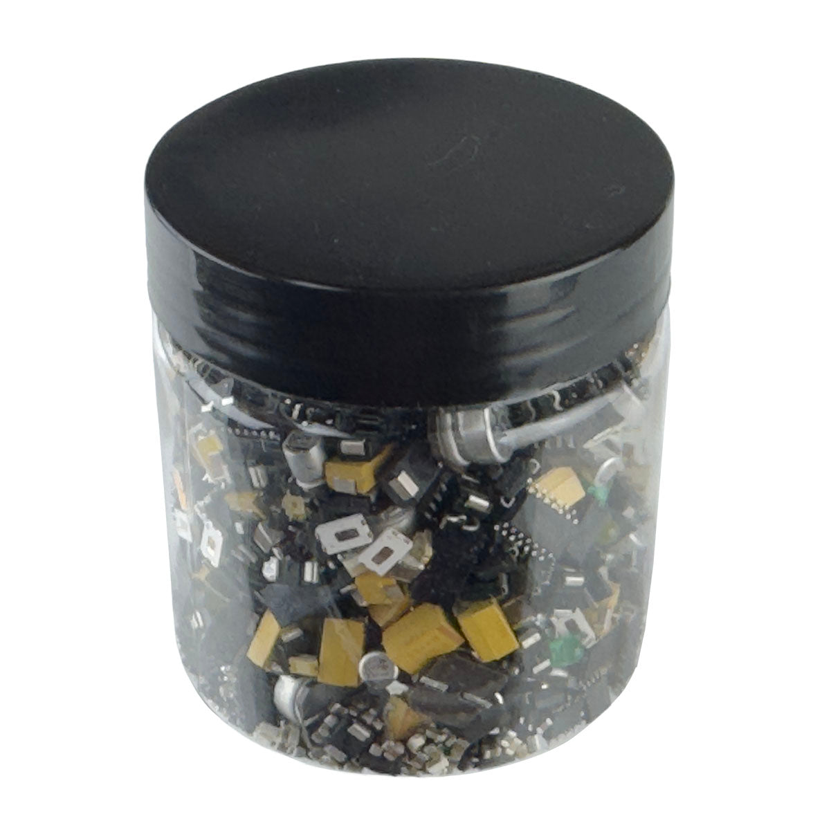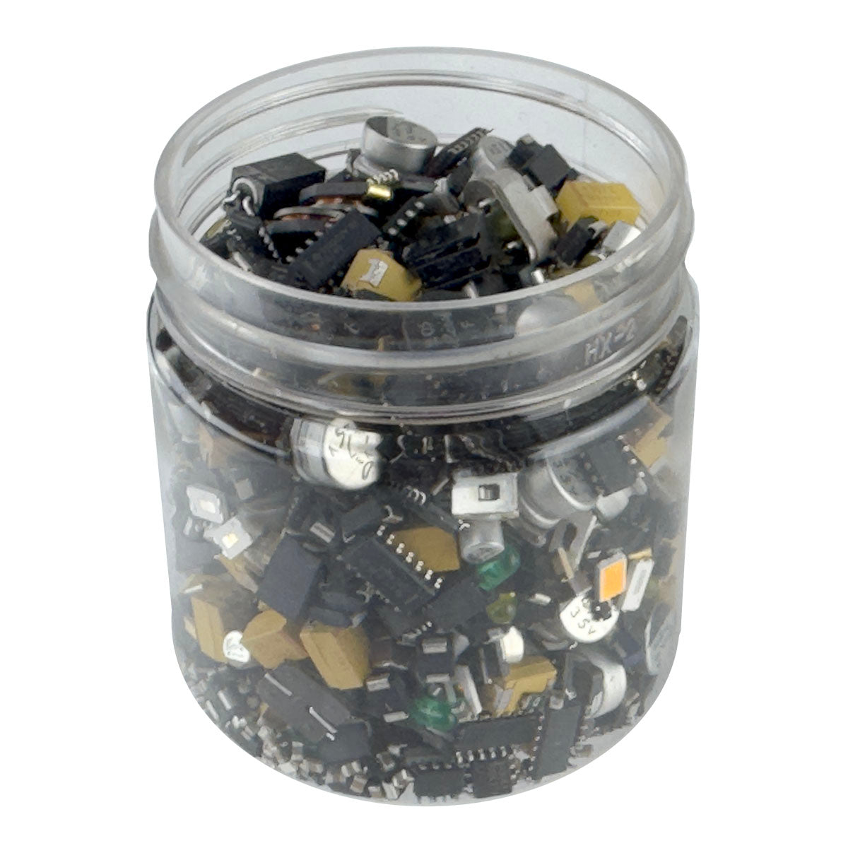 Large clear plastic jar (2" × 2.3") of SMD components. Contains a tremendous amount of parts including various color LEDs, transistors, integrated circuits, coils, trimmers, crystals, capacitors, resistors etc. We counted over 1700 pieces in one jar (counts will vary). Has reclosable lid. A tremendous value! New parts!
