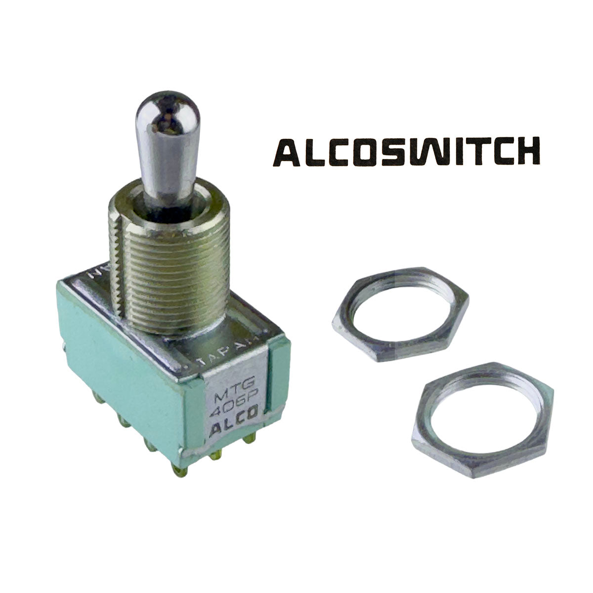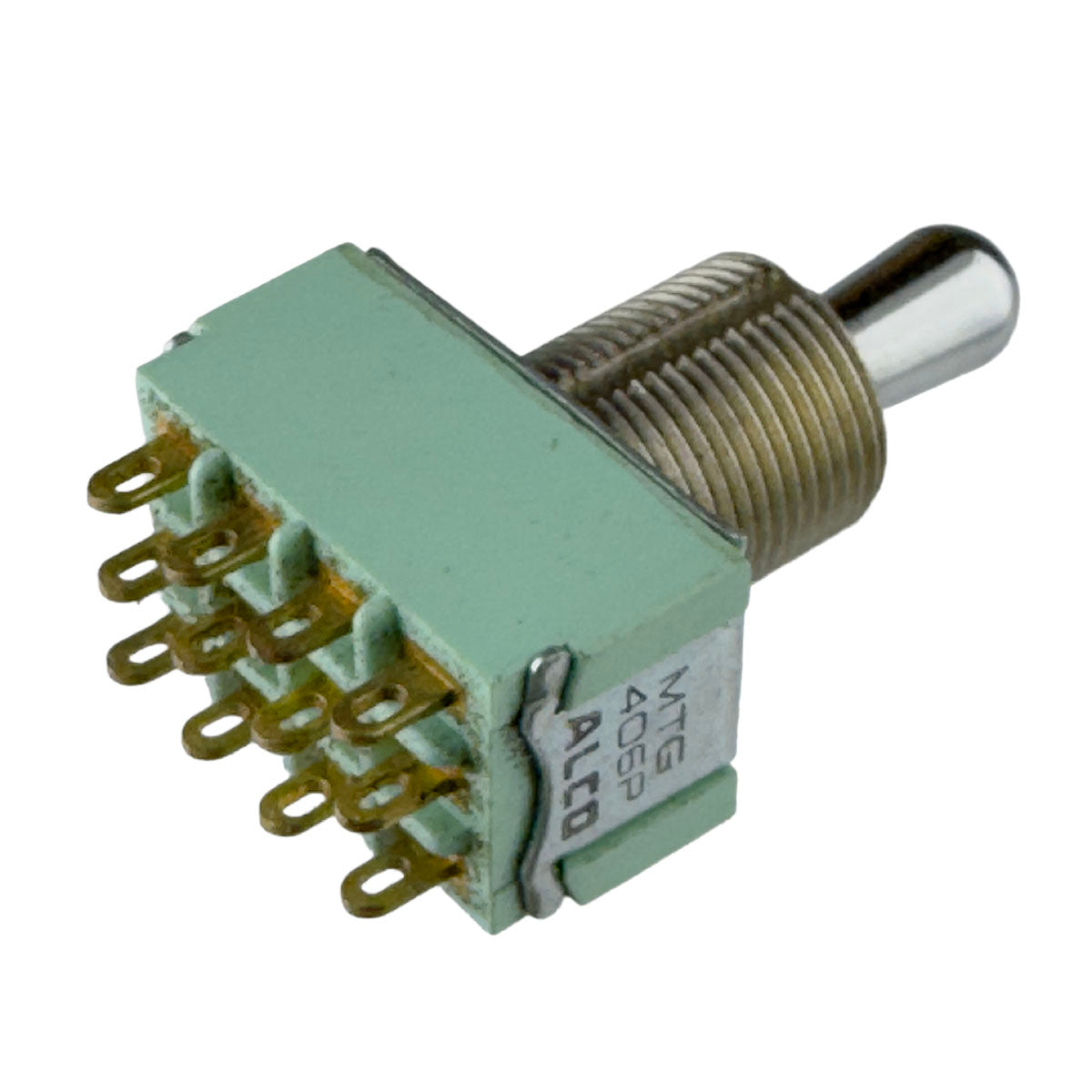 Alcoswitch MTG406P is a 4PDT (On-Off-On) panel-mounting toggle switch with center off position. Contacts rated at 6A @ 125VAC. Gold flash plating. Has15/32" bushing. Complete with 2 panel mounting nuts. New!