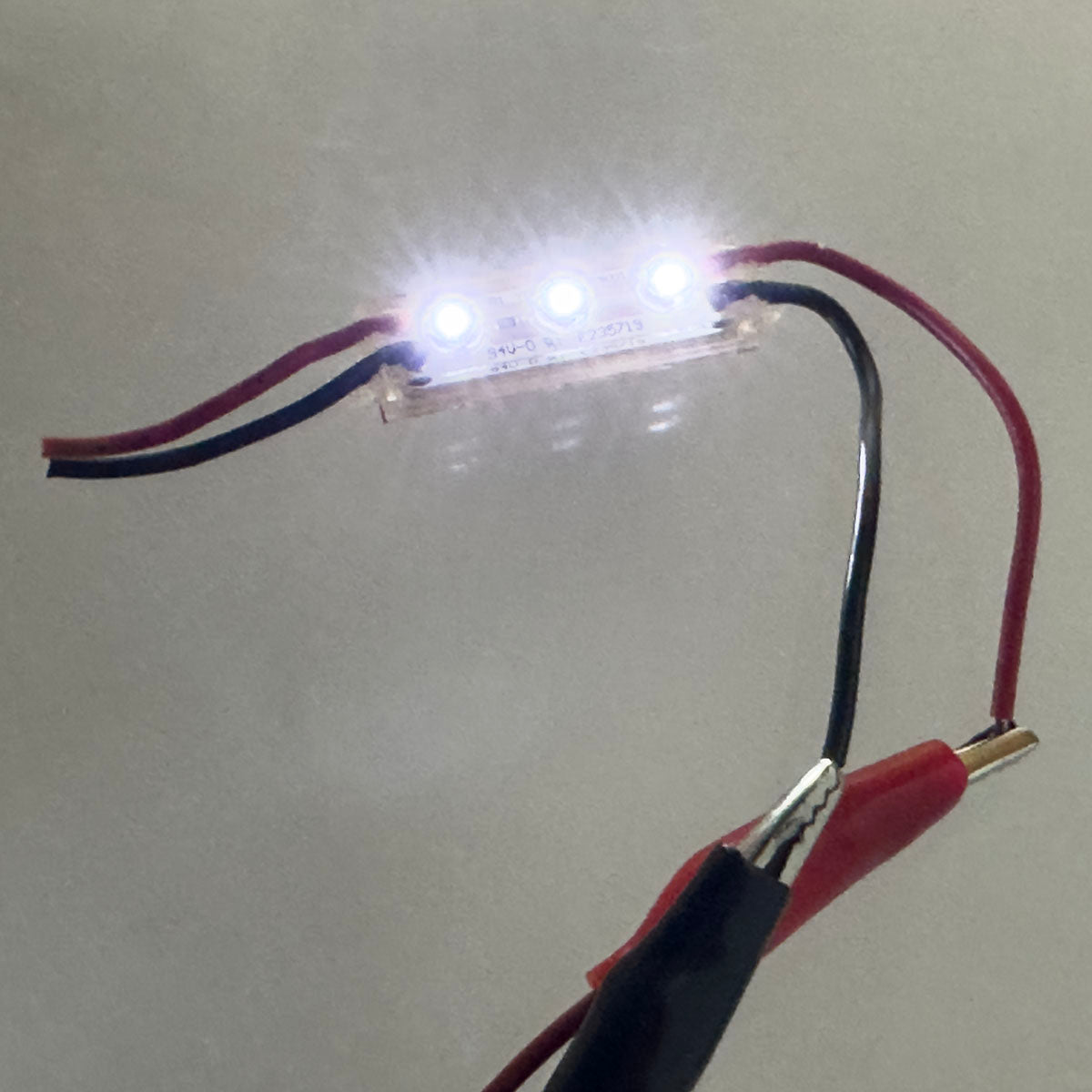 Encapsulated 3 LED bright cool white light bar operates on 12VDC. Has peel and stick pad on bottom and 2 mounting holes on 1.7" centers. Size including mounting ears 1.9" L x 0.44" x 0.37" thick. Has 2 extra leads shown so you can connect to another bar. New.