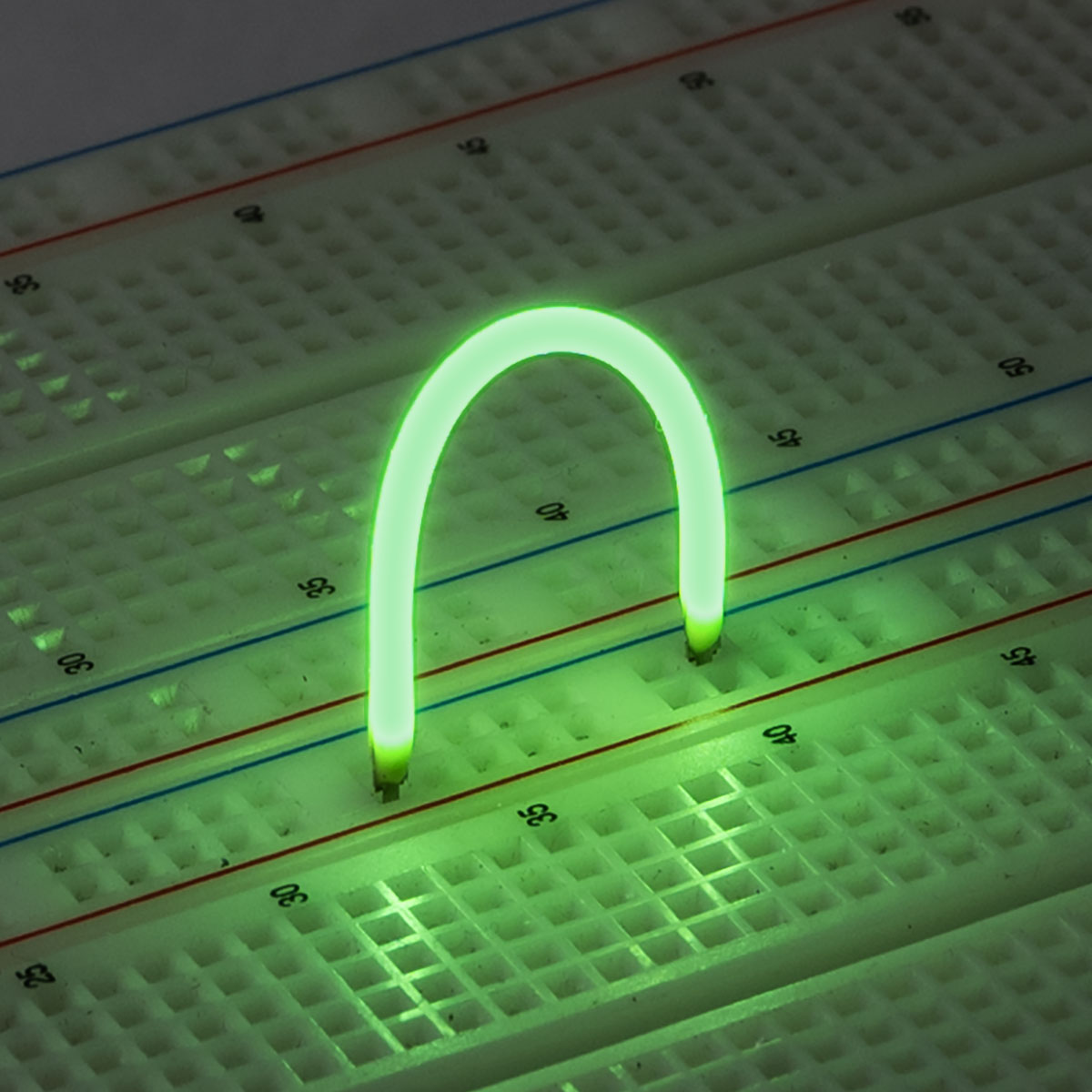Flexible string light with Leds that light up a bright emerald green when 3VDC is applied. Simply connect 3V(+) lead to the metal lead with tiny hole, and (-) to other end. Very flexible! Overall length 60mm - Active length 50mm.