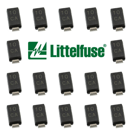 Littelfuse SMAJ10CA SMD TVS Diode is rated voltage Reverse Standoff 10V, Breakdown 11.1V, Clamping Voltage 17V, Peak Pulse Current 23.5Amp, and Peak Power Pulse 400Watt. Sold in a tape and reel package of 25. Retails for $4.25 for 25.