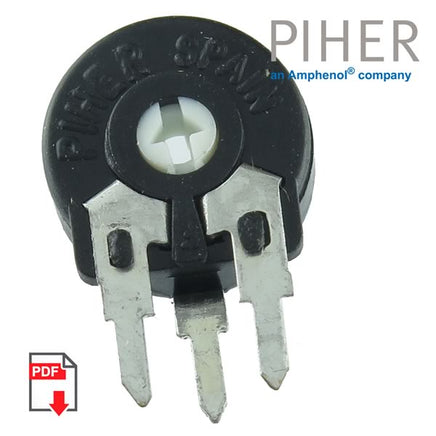 Prime Piher PT10 series 10mm linear taper 500K trimmer resistor. Has 20% tolerance and a nominal power rating of 0.15W. Carbon resistive element is housed in a dust proof enclosure. Vertical mount with horizontal adjustment slot on side. Size (excluding leads) is approximately 10.3mm (0.4") diameter x 4.5mm (0.18"). Has 3 leads for through hole mounting. Sold in a package of 10.