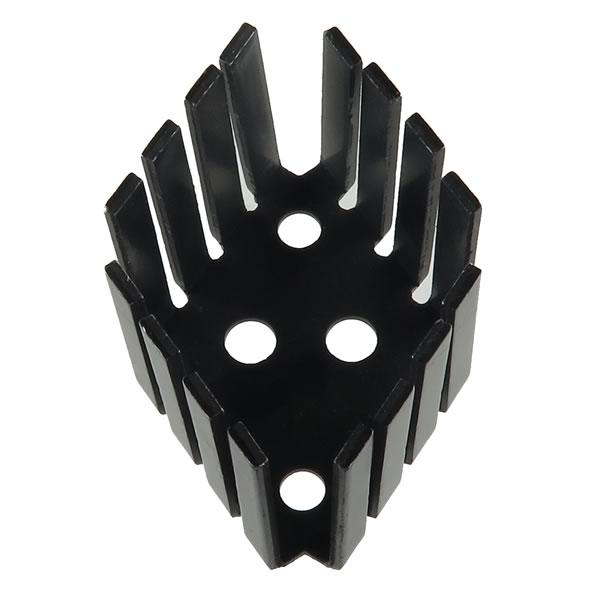 Black anodized aluminum heatsink for TO-3 devices forms a "cup" around the device. Size at widest points is approximately 1.9" long x 1.4" wide x 1.25" tall. Has 4 holes for TO-3 device. Sold in a package of 2.