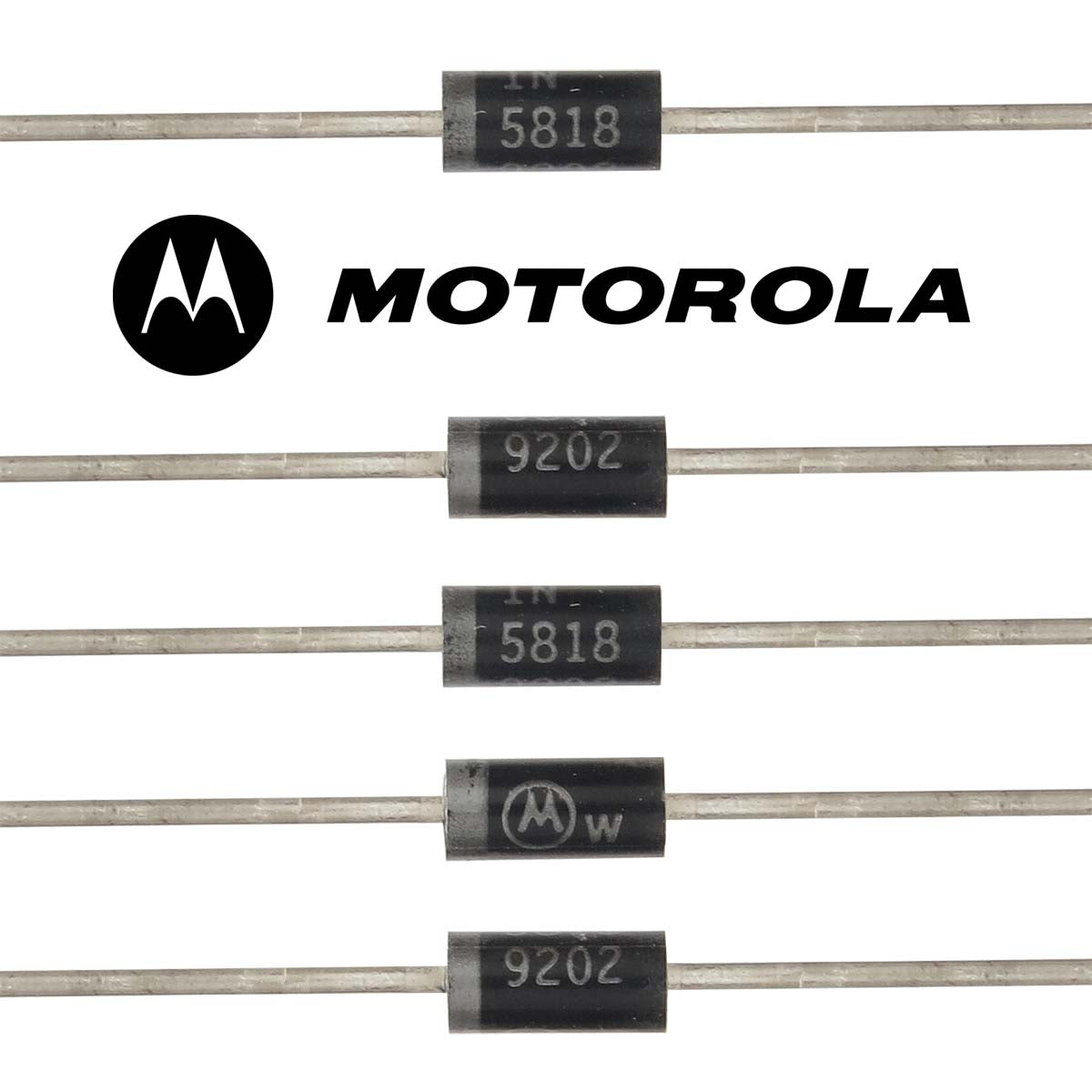 Motorola IN5818 30V 1Amp Shottky Diode features low VF and low power loss. Original Motorola Part - New! Sold in a package of 10 on tape and reel.