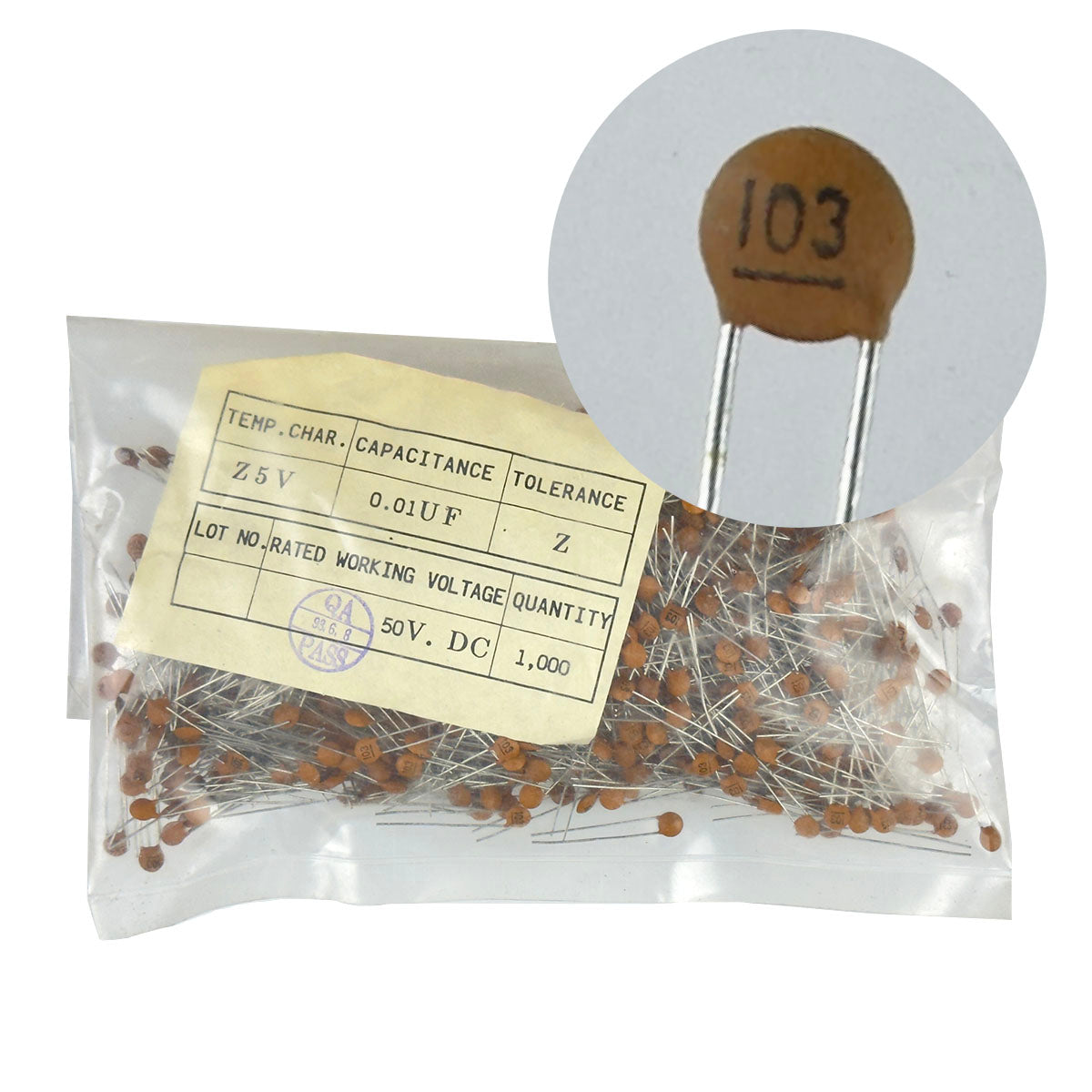 High quality 0.01uf (103) 50V Z5V dielectric and 20% tolerance. Size is 0.188” dia X 0.08” thick. Has full length leads as shown. Sold in a factory bag of 1,000. Retails for $75 for bag of 1,000.