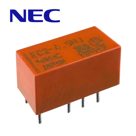 NEC EC2-4.5NJ DPDT relay features contact rating of 2Amp @ 250VAC or 220VDC. Operates on 4.5VDC and coil resistance is 178 Ohm. Size 15mm x 7.5mm x 9mm tall. Has 8 PCB mounting pins. New!