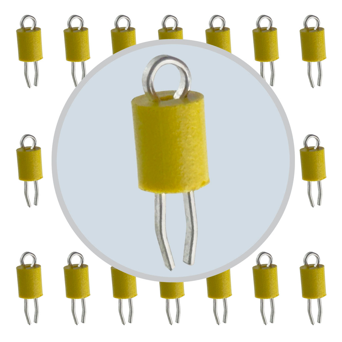 Keystone 5004 miniature PC test point with silver plated phosphor bronze terminal with yellow nylon base. Features wire form loop on top of test point. Very handy mounts into 1mm (0.04") dia. hole. Sold in a package of 20. Retails for $6 for 20.