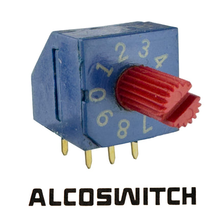 Alco DRM10RA BCD 10 Position right angle DIP PCB rotary switch is only 0.40" x 0.48" x 0.40" tall. Has red activation and 6 PC pins on the bottom.