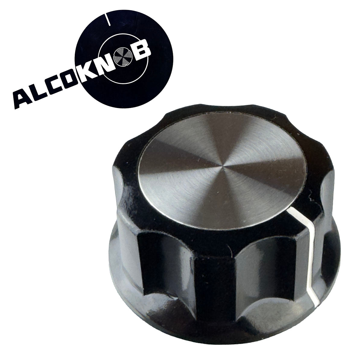 Large beautiful precision knob from Alco is Lexington Series, model PKES120B¼, made for 1/4" diameter shafts. Has attractive black fluted grip with white pointer, skirt, and brushed aluminum inset. Has a set screw for firm grip. Measures about 1.3" in diameter × 0.624" thick. Brand new - retails for $4.35.