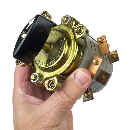 The gray stacked decks function as independent switching sections, allowing multiple circuits to be controlled simultaneously. Heavy brass and copper contacts provide excellent conductivity and reliability, while the zinc-plated steel housing offers outstanding durability. The black handle rotates smoothly, ideal for use as a selector or power switch.